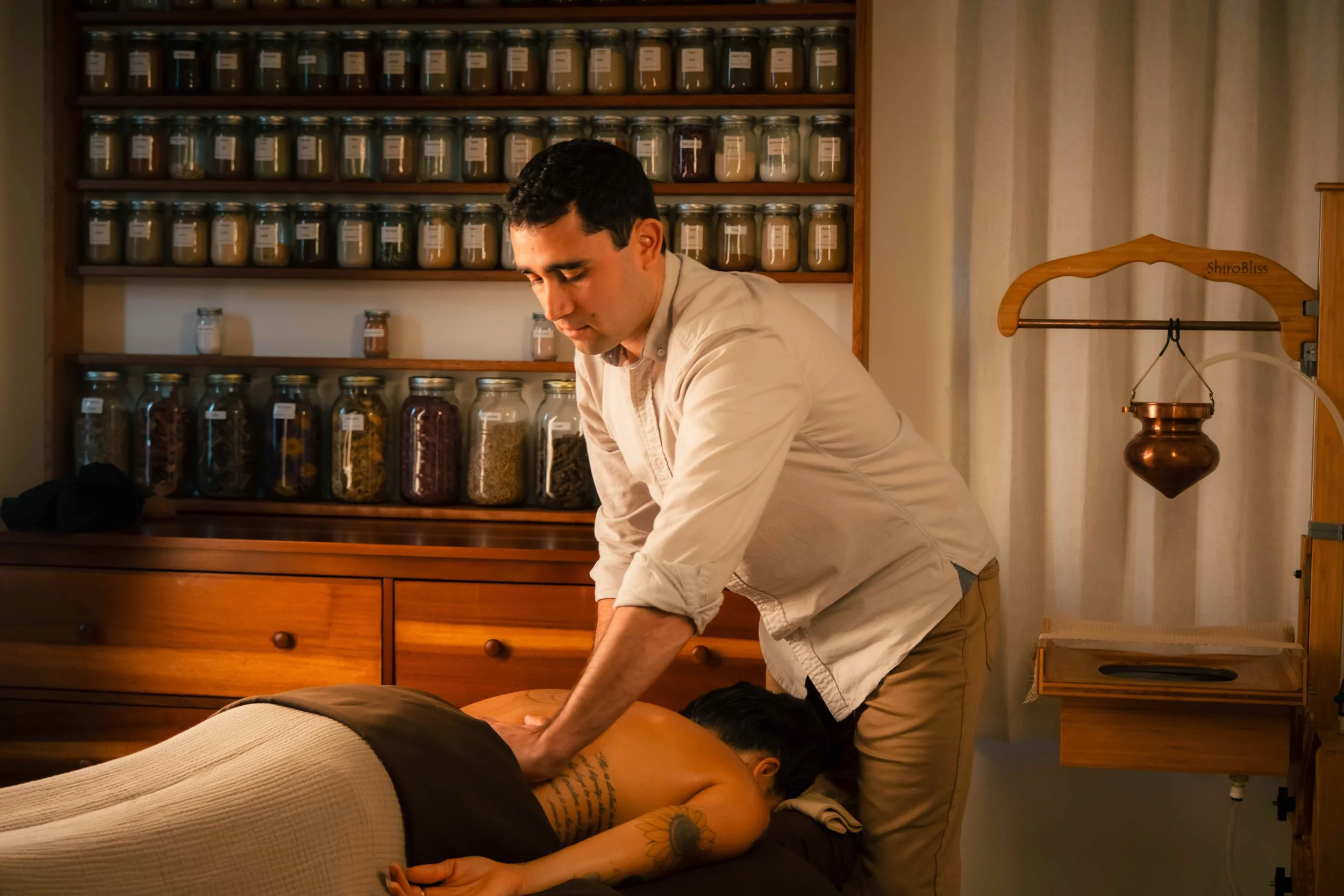 A deeply calming process involving a continuous stream of warm, medicated oil applied to the forehead to support nervous system regulation, sleep, stress, and mental clarity. Excellent for those suffering from headache, migraines, and facial tension. In addition to the shirodhara, this session often includes full-body massage, acupressure, and some elements of sound healing to help lymphatic flow and facilitate deep relaxation.