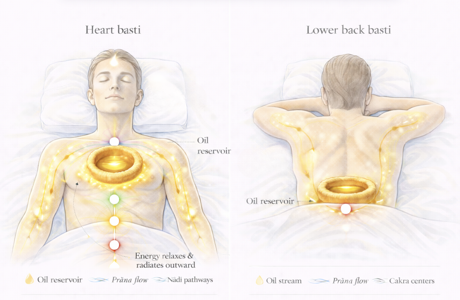 Topical basti can be customized with different herbal oils and blends and applied to many regions: heart/chest (uro basti), throat/thyroid area (jatru basti), lower abdomen for vata type menstrual cramping (nabhi basti), knees (janu basti), eyes (netra basti), and the low, mid, or upper back—based on your constitution and what the tissues need.