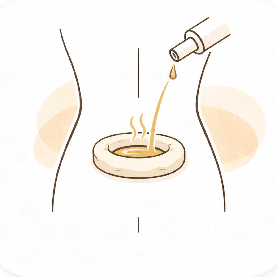 For cramping patterns with a clear vata signature, topical basti at the navel or lower abdomen is sometimes used as supportive care in the weeks leading up to the bleeding phase. In Ayurvedic language, this is closely related to settling apāna vāyu, which governs downward movement in the pelvis and colon. When apāna is disturbed, cramping can feel sharp, spasmodic, and irregular, often paired with dryness, tension, constipation or variable stools, anxiety, lower-back pulling, or a sense that the body can’t “let go” into the downward flow of the cycle.