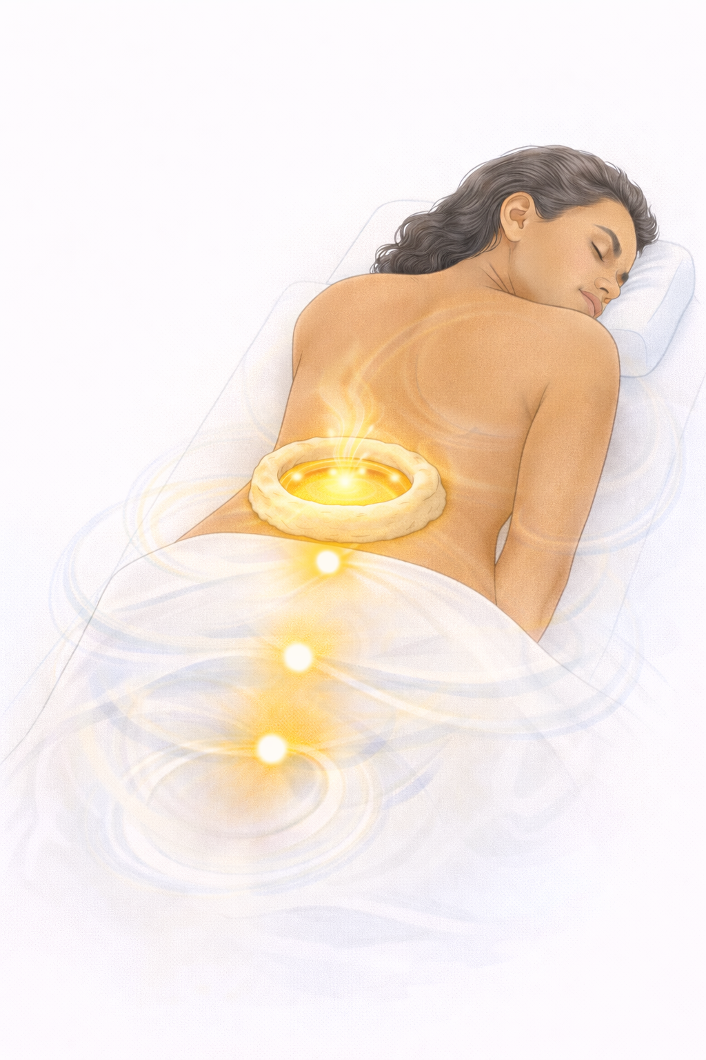 Subtly, this therapy is about restoring containment. Pain can scatter attention, and the body often holds a background brace around the problem area. When warm oil is held in one place long enough, the tissues begin to trust the contact. Many people notice the region feels more coherent and less reactive afterward, like the body no longer has to keep watch there.