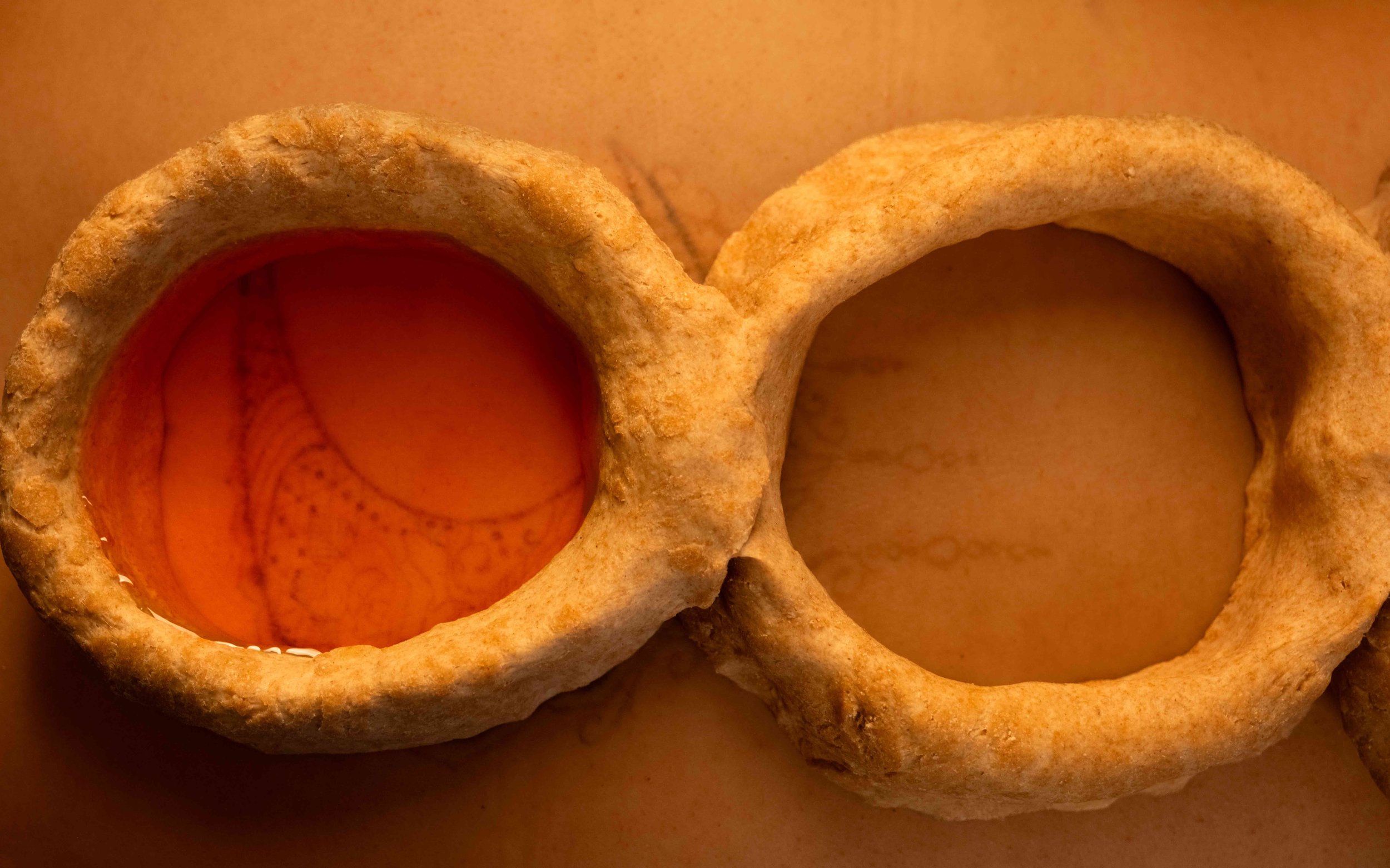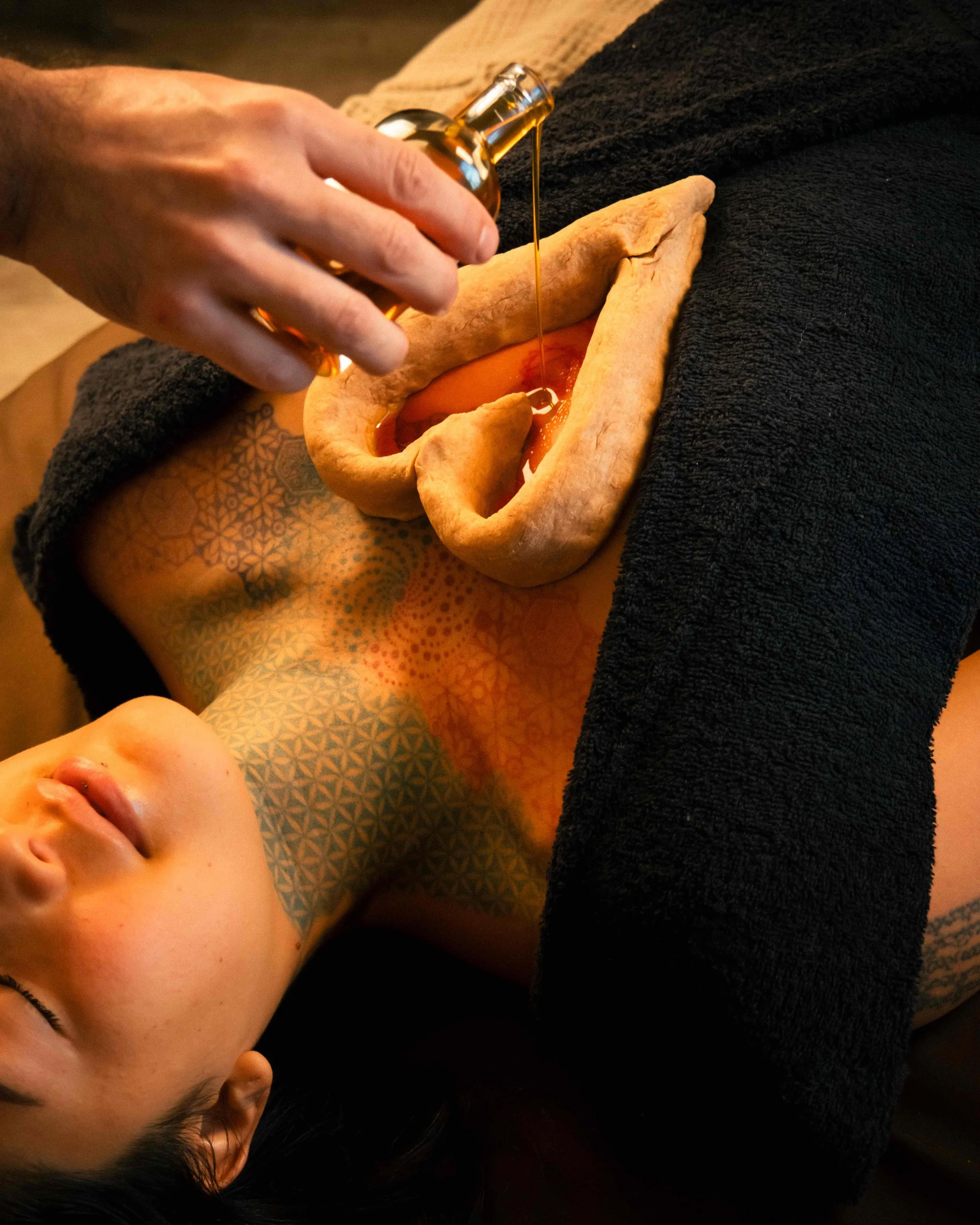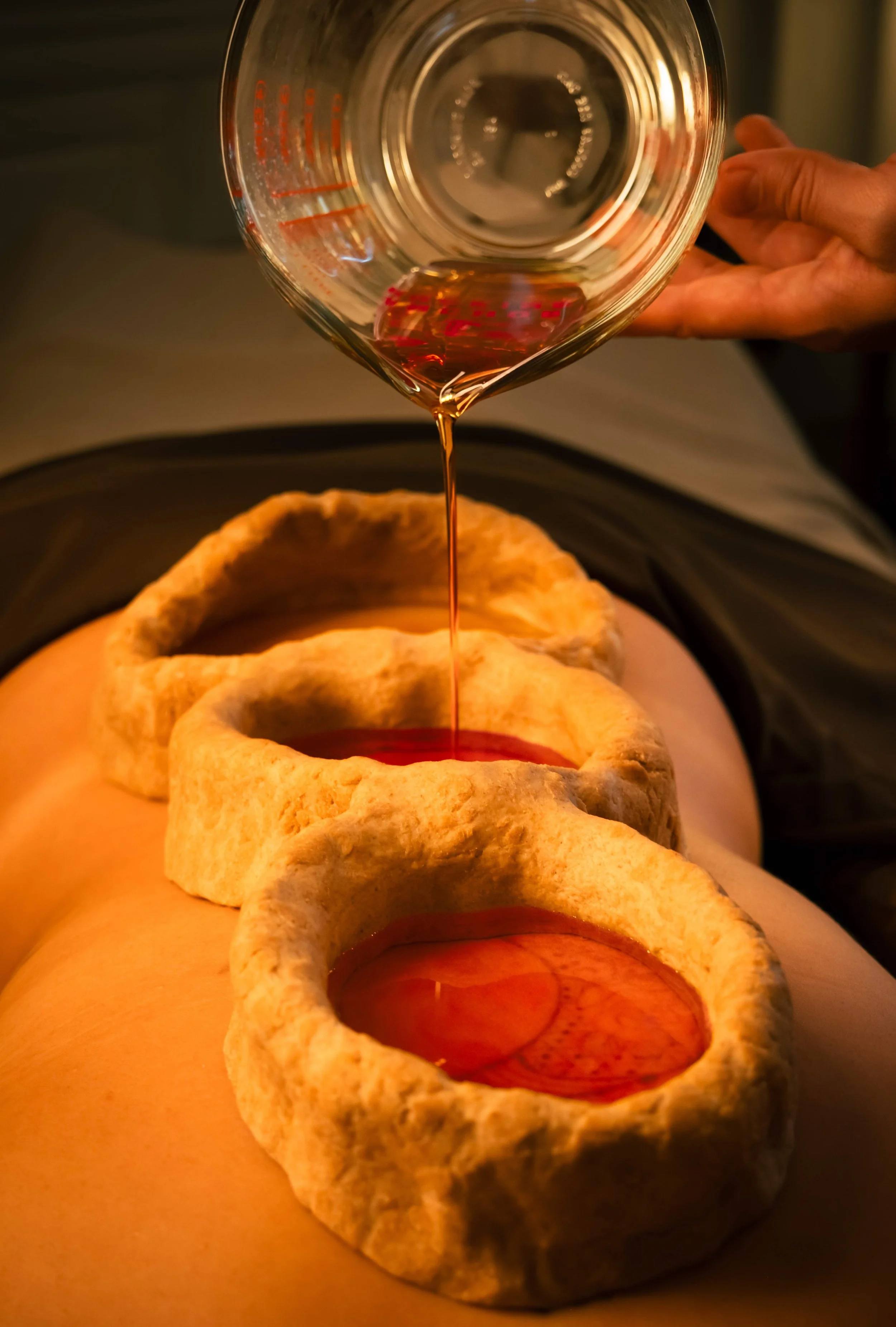 A soft dough ring is made and sealed onto the body using a blend of wheat flour and chickpea flour. This creates a comfortable reservoir that stays secure over the target region.