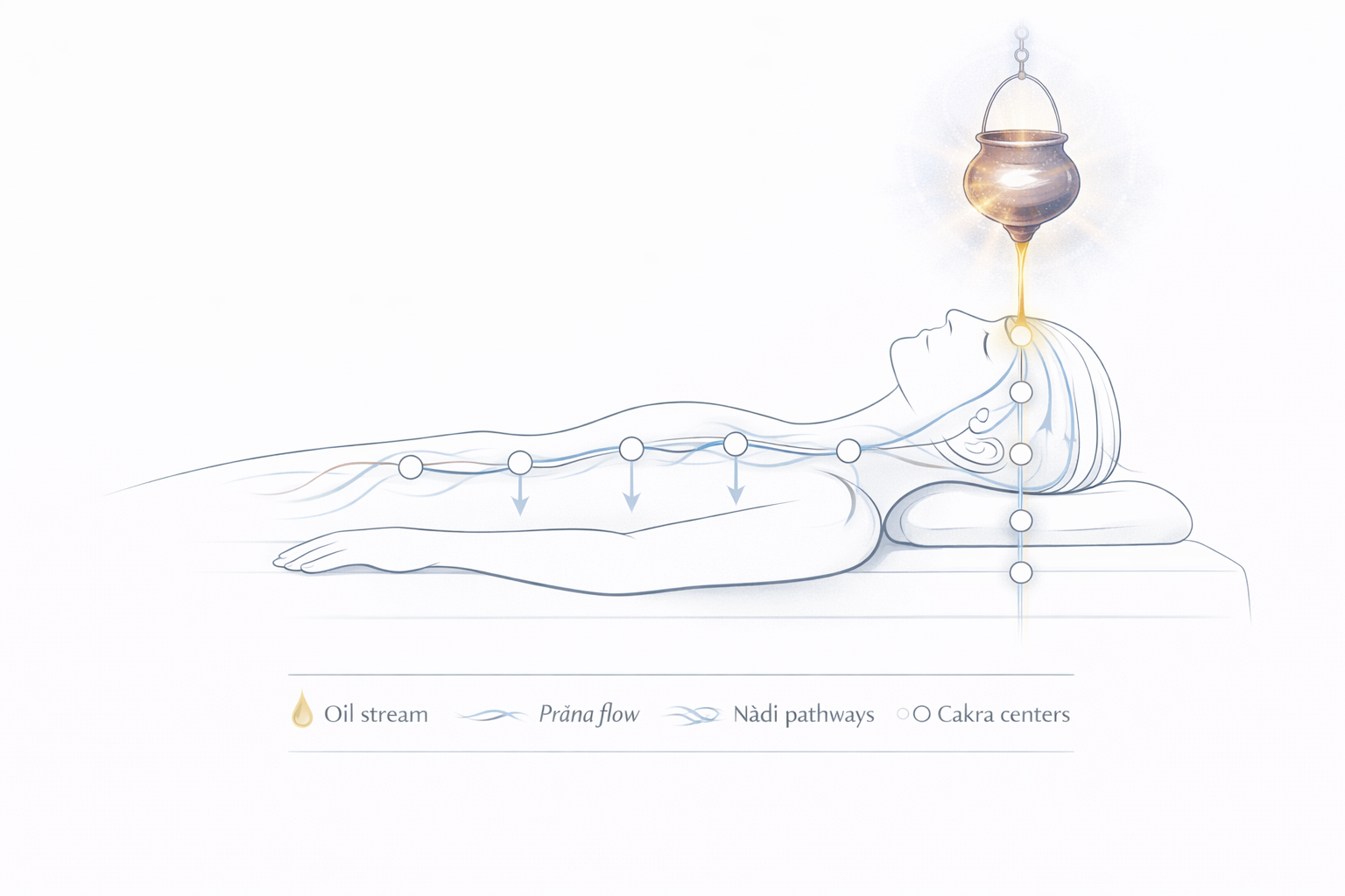 In practice: a steady flow of warm herbal infused oil onto the head/forehead region.