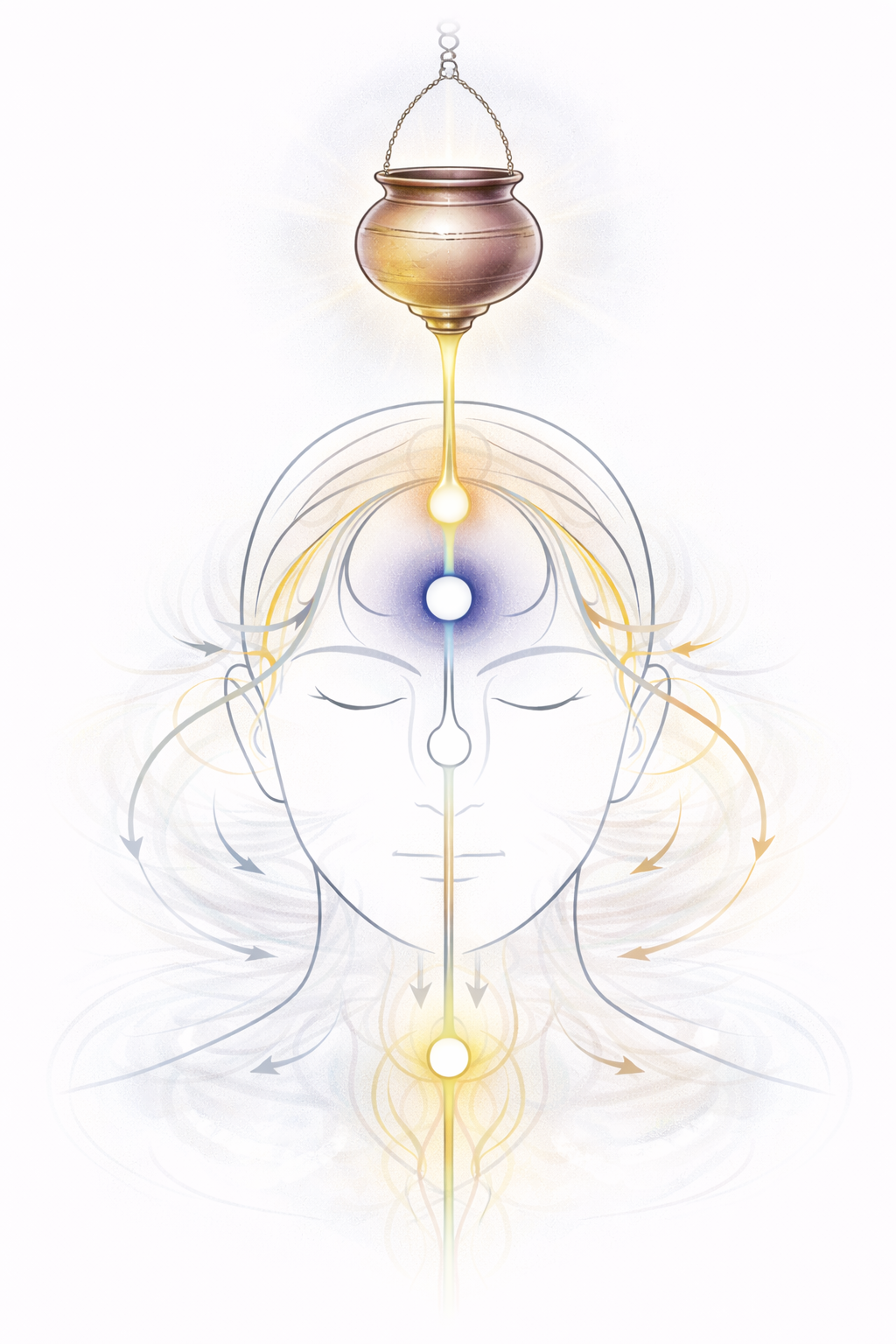 The steady oil stream lands at the center of the forehead, a point traditionally associated with mind, perception, and the meeting place of subtle channels. From an energy healing lens, this is like giving the system a gentle, rhythmic anchor. The flow is continuous and predictable, which invites the mind to stop scanning, stop bracing, and start settling.